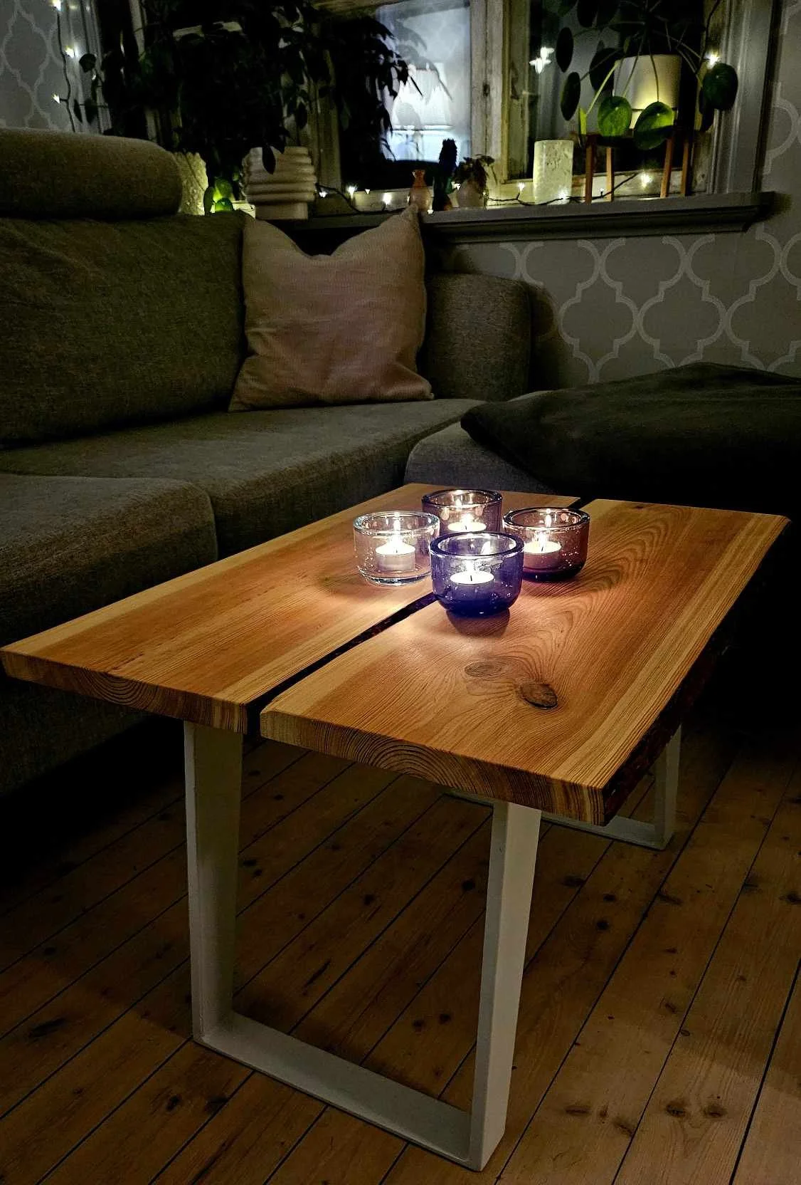 Så med det sagt så erbjuder jag plankbord, bänkar och hyllor där ni har möjligheten att önska både mått och ytbehandling, t ex med olja eller betsning i önskad nyans. Både soffbord och större matbord är möjligt att få, samt bänkar och vägghyllor. Jag håller även på att arbeta fram en passande design på stolar som kommer framöver.